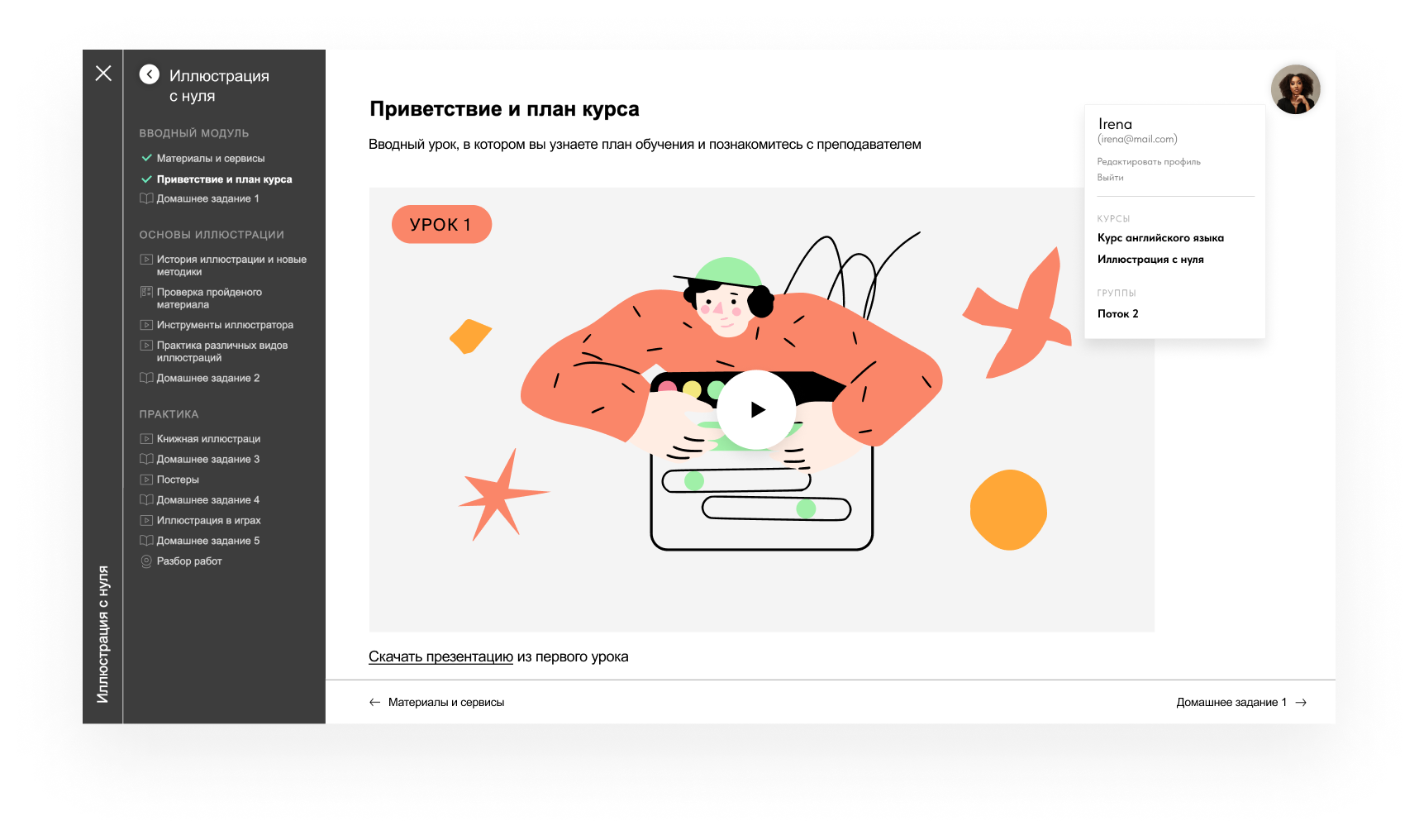 Проводите прямые эфиры и разборы домашних работ онлайн, чтобы стать ближе к аудитории и ответить на вопросы в реальном времени. Добавьте в лекцию ссылку на стрим с YouTube или любого другого сервиса.